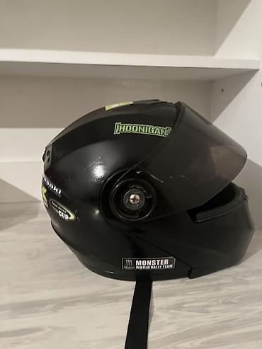 Мотошлем модуляр (флип‑ап), цвет — черный, со стикерами Monster, Hoonigan, Kawasaki/Ninja Cup.