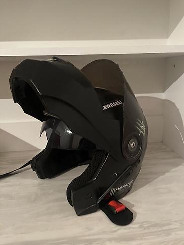 Подходит для мотоцикла, скутера или квадроцикла; сочетает защиту закрытого шлема и удобство открытого за счет откидной челюсти. Размер ориентировочно средний (визуально), ремешок регулируемый.