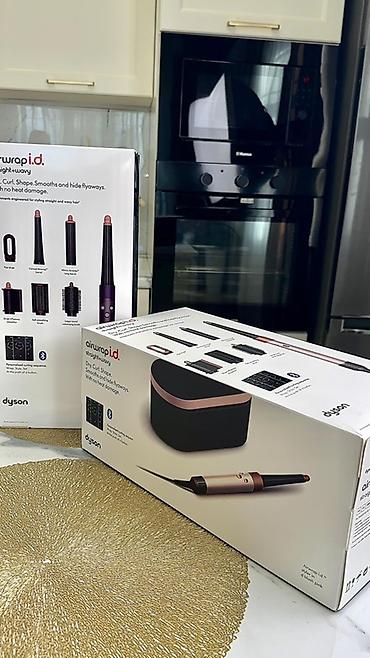 В наборе видно фирменную упаковку Dyson и полный комплект насадок с футляром.