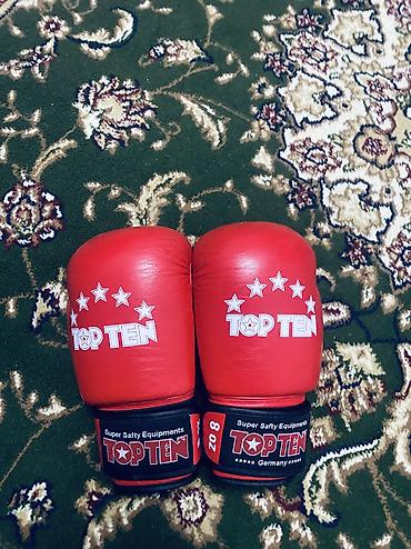 - Боксерские перчатки TOP TEN (серия Super Safety Equipments), красные. Широкая манжета на липучке для фиксации запястья, плотный ударопоглощающий наполнитель, внешняя маркировка «Germany». Подходят для тренировок и спаррингов.