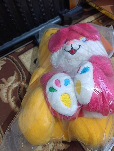 - Плюшевый розовый кролик с белой мордочкой и разноцветными подушечками на лапках, длинные ушки с узором.