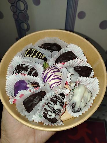 - Финики и сухофрукты в шоколадной глазури, оформленные в бумажных капсулах.