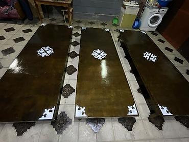 Низкие деревянные дастарханы/тақтаны для пола с узорной инкрустацией. - Материал: массив/фанера светлых пород, точёные ножки. - Формат: прямоугольные, складные по центру (столешница из двух полови...