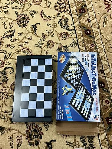- Комплект для трех игр: шахматы, шашки и нарды (Backgammon/Checkers/Chess).
