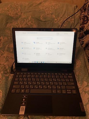 Ноутбук Lenovo IdeaPad (линейка по наклейке — IdeaPad Flex/IdeaPad серии 13/14). Компактный, тонкий корпус тёмно‑серого цвета, петли позволяют раскрывать экран на широкий угол. Русско‑английская клавиатура островного типа, большой тачпад.
