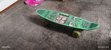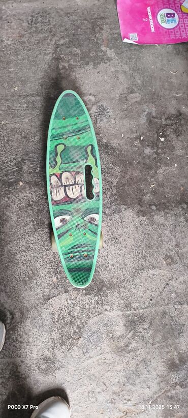 - Дека из прочного пластика с перфорацией и ярким рисунком в зелёных тонах (графика с лицом/зубами).