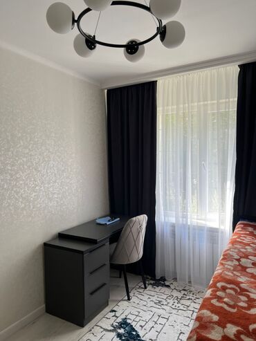 - Окна: двойные шторы — плотные и тюль, на окнах решетки.