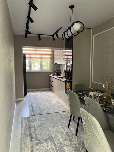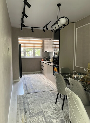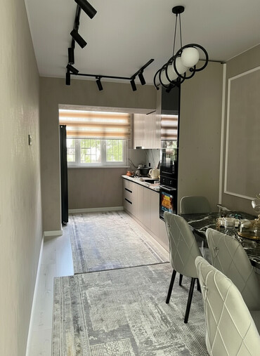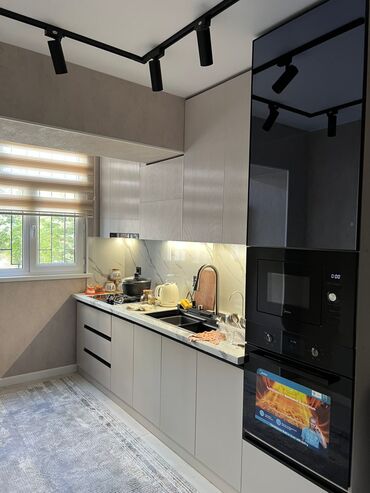 - Кухня: полный комплект встроенной техники — варочная панель газовая, духовой шкаф и микроволновая печь,холодильник, вытяжка, мойка с высокой смесительной дугой. Есть чайник, посуда и базовые кухонные принадлежности.