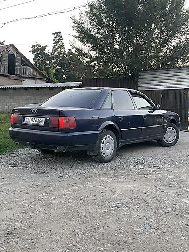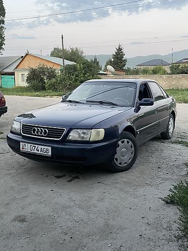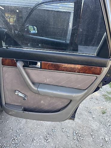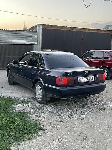 Audi A6 C4 седан, темно-синий цвет. Основные характеристики по фото: - Кузов: 4-дверный седан, темно-синий, тонированные стекла. - Оптика: прямоугольные фары, передняя решетка с эмблемой Audi. - К...