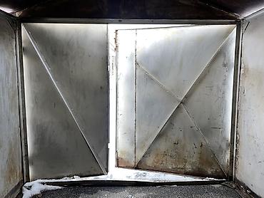 Металлический гараж в ГК#11 по ул. Малдыбаева. - Материал: стальной каркас и листовой металл, двускатная крыша. - Внутри: смотровая/погребная яма - Пол: бетонная стяжка. - По стене — полки/тумб...