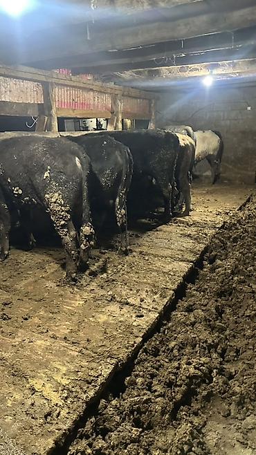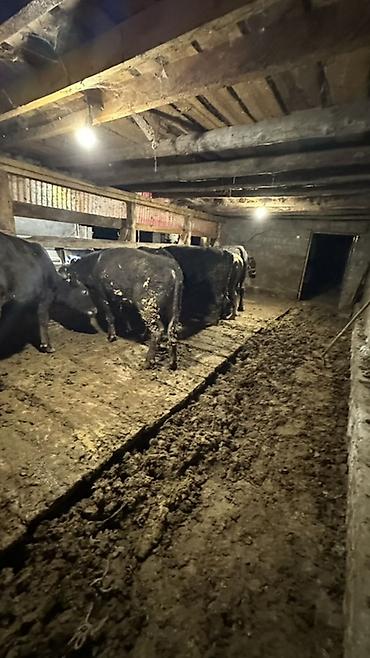 - Условия содержания на фото: деревянные стойла, бетонный пол с настилом, вентиляционные проемы; поилки/кормушки установлены вдоль перегородок.