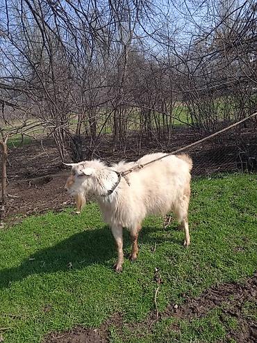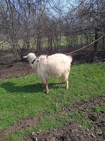 Козёл (домашний, бородатый), светло-кремовая шерсть, рога короткие. На фотографиях — на пастбище, на привязи с ошейником. Плотное телосложение, хорошо развитая грудь и спина. Шерсть густая, длинная, подходит для вычёсывания пуха и утеплённых подстилок.