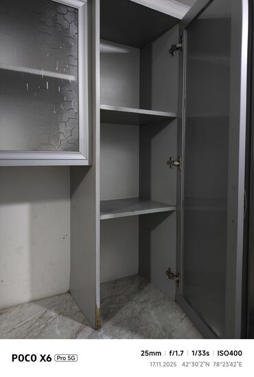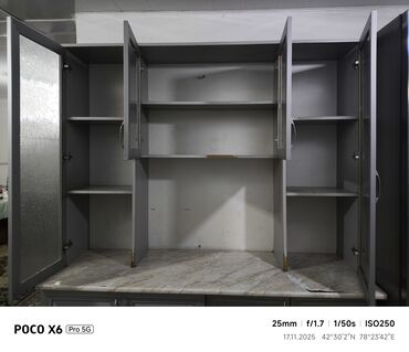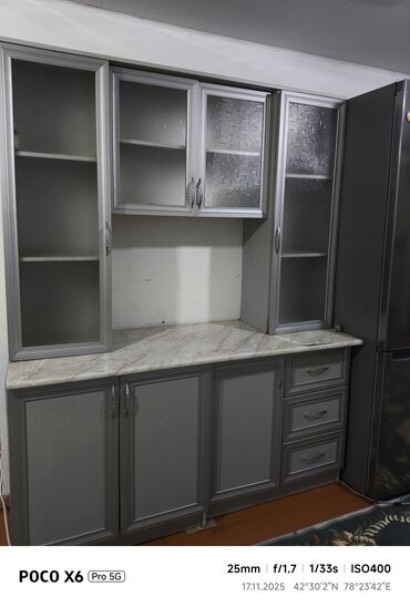 цена без мойка 12000 с мойкой 13500 доставка по городу бишкек 500 Кухонный гарнитур с серыми фасадами, имитирующими бетонную поверхность, и столешницей с рисунком под белый мрамор. Верхние шкафы с ...