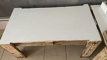 - Низкий прямоугольный стол: деревянные ножки и каркас, светлая столешница.