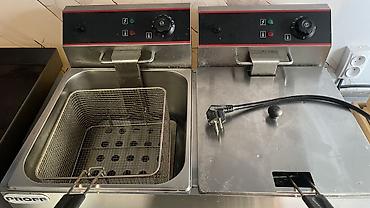 - Двухсекционная электрическая фритюрница настольная: две независимые ванны с корзинами, крышками и механическими термостатами, световые индикаторы, сетевой шнур.