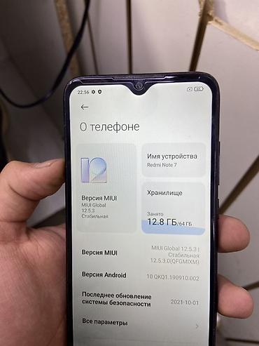 Смартфон Redmi Note 7, синий. Характеристики и особенности: - Экран с каплевидным вырезом. - Память: 64 ГБ (занято около 17,7 ГБ по скриншоту). - ОС: Android 10, оболочка MIUI Global 12.5.3 (стаб...