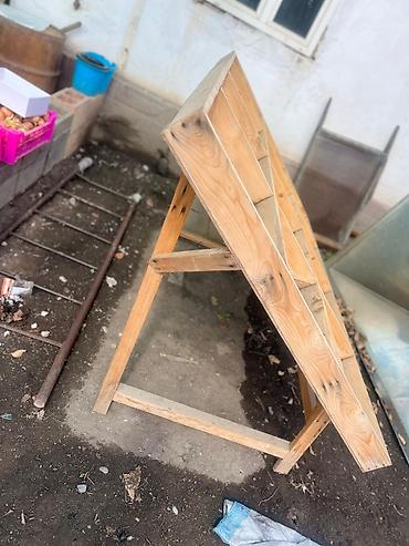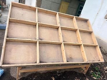 - Конструкция: наклонный стол на прочном каркасе из бруса с разделителями, образующими 12 прямоугольных ячеек. Для торговли овощи и фрукты.
