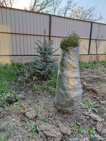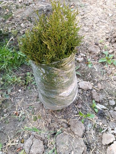 - Туя западная (вероятно, колоновидная форма): саженец в свёрнутом коме, крона плотная чешуйчатая, вечнозелёная. Идеальна для живых изгородей и бордюров. Предпочитает солнечные участки или полутень, регулярный полив в первое время после посадки, формирующую стрижку переносит отлично.