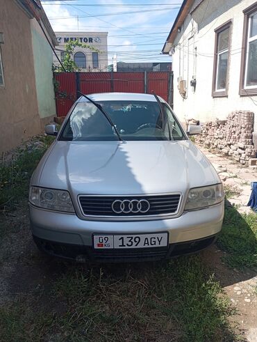 Серебристый седан Audi A6 C5 с характерной решеткой радиатора и эмблемой Audi. Автомобиль оснащен литыми дисками с пятью спицами и имеет тонированные задние стекла. Эта модель Audi A6 C5 известна своим просторным салоном и комфортом, что делает ее подходящей для повседневного использования и дальних поездок. Обладает классическим дизайном, который по-прежнему актуален.