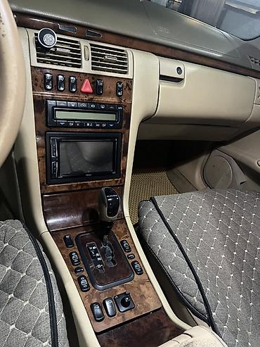 Салон бежевый, отделка натуральным деревом. Автоматическая коробка передач с селектором на центральном тоннеле. Многофункциональная центральная консоль: климат‑контроль, подогревы сидений, электроприводы и память сидений, управление стеклоподъемниками и зеркалами. Установлена мультимедийная система (двойной DIN) с экраном, родная аудиосистема сохранена в блоке выше. Воздуховоды, бардачок, ниша‑подстаканник, прикуриватель/12V. Тканевые накидки на сиденьях, фирменные пороги Mercedes‑Benz, коврики под цвет салона. На руле — заводская эмблема, приборная панель с классическими шкалами.
