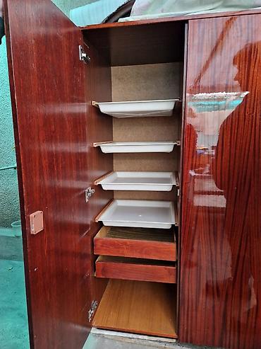 - Внутреннее наполнение: две полноценные секции для одежды на вешалках (металлические штанги по всей ширине), просторное нижнее отделение для коробок/обуви.