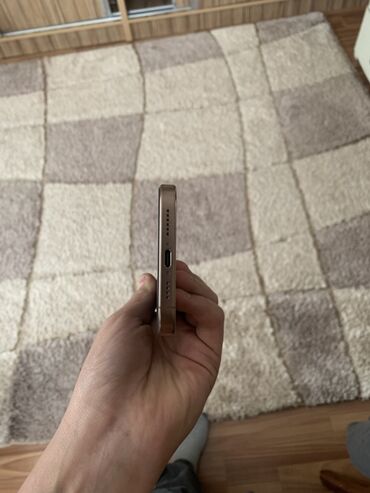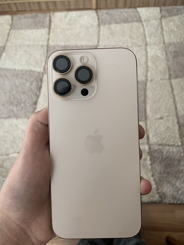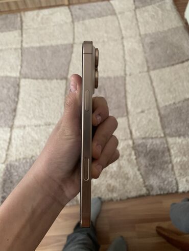 Айфон 16 pm Смартфон Apple iPhone (серия Pro, цвет «натуральный титан/золото»). Корпус с плоскими гранями, блок из трех камер с лидаром, матовая задняя панель. На нижней грани — порт USB‑C, стереодинамики и микрофон. Слева — клавиши громкости и переключатель режима/Action Button, слот под SIM-лоток отсутствует (eSIM). Большие объективы камер с металлическими окантовками.
