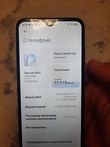 Смартфон Redmi Note 7, синий градиент. Основные характеристики: - Экран 6.3" с каплевидным вырезом, тонкие рамки. - Память: 4 ГБ ОЗУ / 128 ГБ встроенной (скриншот “О телефоне”: занято 15.1 ГБ из 1...