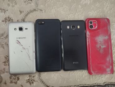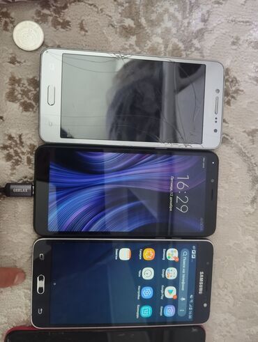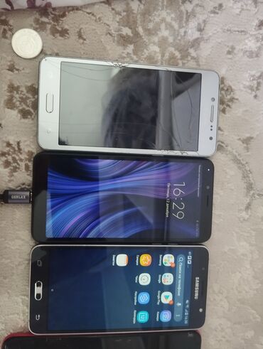 - Samsung Galaxy (несколько моделей с кнопкой «Домой» и фирменным интерфейсом). Один из аппаратов имеет треснувшее защитное стекло/экран в верхней части.