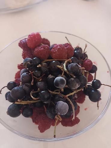 Смесь ягод: малина и чёрная смородина. - Состав: целые ягоды малины и грозди чёрной смородины. - Обработка: заморозка (ягоды покрыты тонкой ледяной глазурью для сохранения вкуса и витаминов). - По...