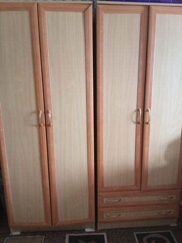 - Два двухстворчатых шкафа: один со стандартными дверцами, второй с двумя выдвижными нижними ящиками. Ручки дугообразные металлические.