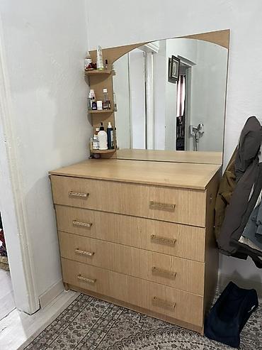 - Зеркало над комодом с боковой открытой стеллажной секцией для косметики и мелочей.