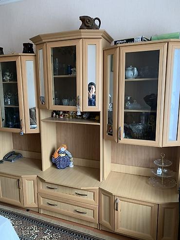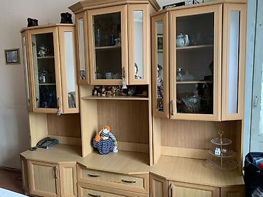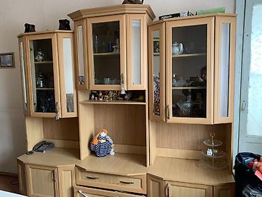 - Два симметричных витринных шкафа со стеклянными дверцами и внутренними полками для посуды, бокалов, сувениров.