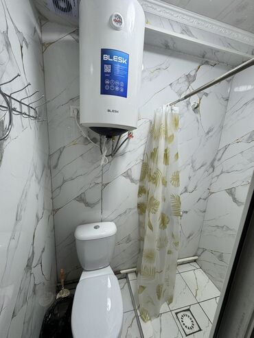 - Санузел с душем (шторка), унитазом, водонагревателем BLESK и вытяжкой.