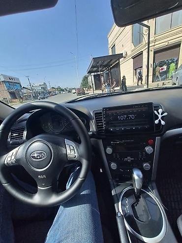 Subaru Outback (BL/BP), универсал, темно-синий цвет. Полный привод Symmetrical AWD, высокий клиренс, фирменный горизонтально-оппозитный двигатель Subaru. АКПП с режимами P-R-N-D-3-2, подрулевые переключатели на руле.