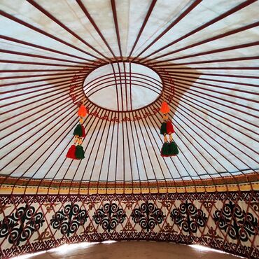 Юрта традиционная разборная - Диаметр: около 5 м . Подходит для размещения семьи, зоны отдыха, мастерских и мероприятий. - Каркас: деревянный, решетчатые стены (кереге) с веревочными стяжками; куп...