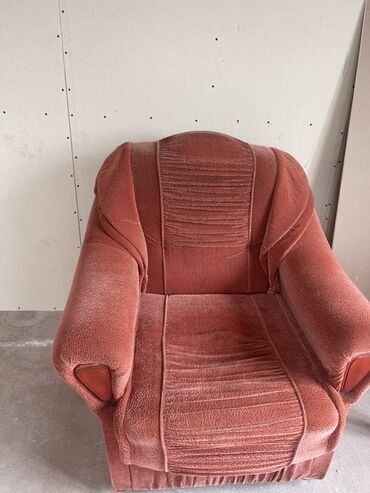 Без рассрочкиКомплект мягкой мебели, состоящий из трехместного дивана и кресла, обтянутых терракотовой велюровой тканью. Диван и кресло имеют мягкие подлокотники и спинки с декоративными складками. Комплект может подойти для создания уютной зоны отдыха в гостиной или кабинете.