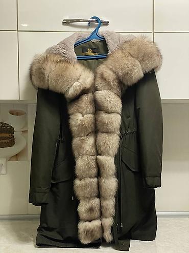 - Богатый меховой декор по борту и капюшону в натуральном бежево‑сером оттенке.