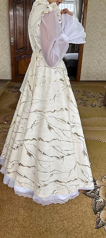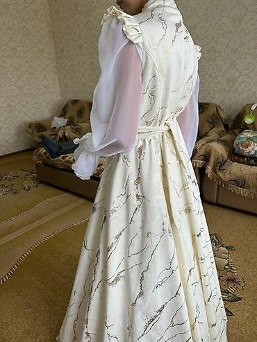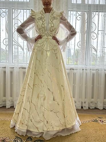 Элегантное женское платье на кыз узатту с длинными прозрачными рукавами и пышными оборками на манжетах. Платье выполнено в светлых тонах, украшено золотистым узором, напоминающим мраморные прожилки. Лиф и пояс декорированы вышивкой из жемчуга, бисера и страз, а также ниспадающими жемчужными нитями, придающими наряду изысканность. Модель идеально подходит для торжественных мероприятий и свадеб. Материал: текстиль.Тип рукава: длинный, прозрачный.Декор: жемчуг, бисер, стразы.Силуэт: А-образный.Цвет: кремовый с золотистым.Стиль: торжественный.Тип застежки: молния на спинке.Уход: абсолютно новое платье. Брала для себя но не надевала еще.Дополнительно: оборки на манжетах.Особенности: многослойная юбка.Посадка: приталенная.Коллекция: праздничная.Сезон: всесезонный.Модель: А-силуэт.Фасон: макси.Элементы: вышивка.Крой: расклешенный.