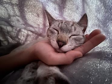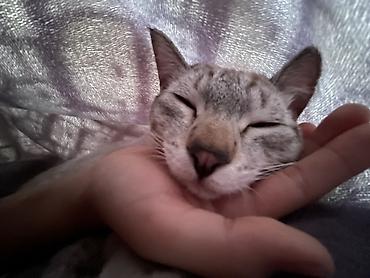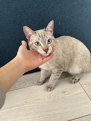 Кошка с голубыми глазами, короткошёрстная, окраса силвер/крем с выразительными табби-полосами на лапах и голове. Компактная, аккуратная, с крупными ушками и розово‑тёмным носом. Очень контактная: любит, когда её берут на руки, обожает спать, положив мордочку на ладонь, урчит и расслабляется рядом с человеком. Спокойный, ласковый характер, ориентирована на общение, хорошо ведёт себя в доме, быстро привыкает к новому месту.