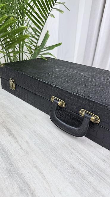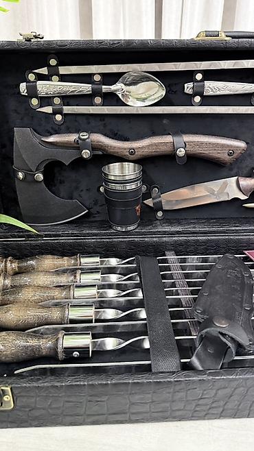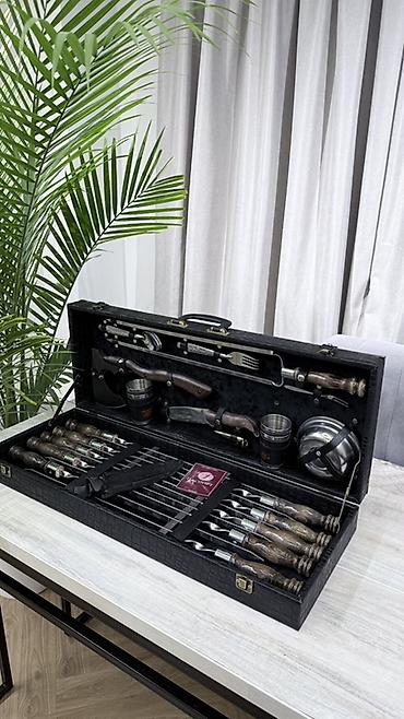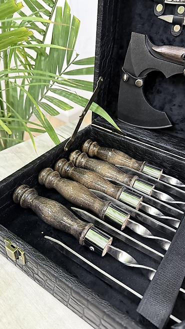 Комплект в жестком футляре под кожу с ручкой и замками. Внутри — полный набор для приготовления шашлыка и гриля на открытом огне.