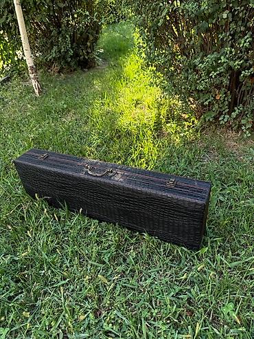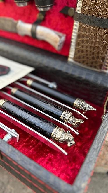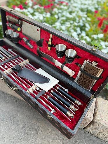 Внутри кейса,аккуратно расположены шампуры с головами зверей,нож Кизлярский,нож-тяпка, фляжка, стопки,раскладной походный мангал и другие аксессуары, необходимые для комфортного пикника.