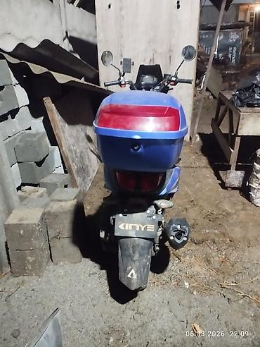 Подойдёт для городской езды и коротких поездок с багажом: есть ветровая защита, кофр и удобная посадка. Марка и шильдик KINYE, цвет — синий с чёрными элементами. На руле установлен держатель для телефона.