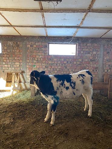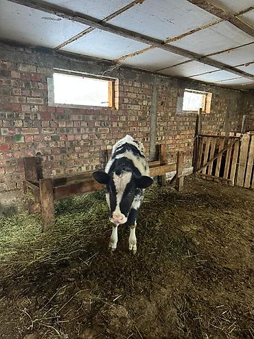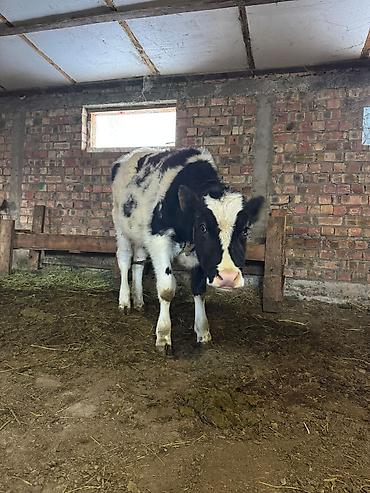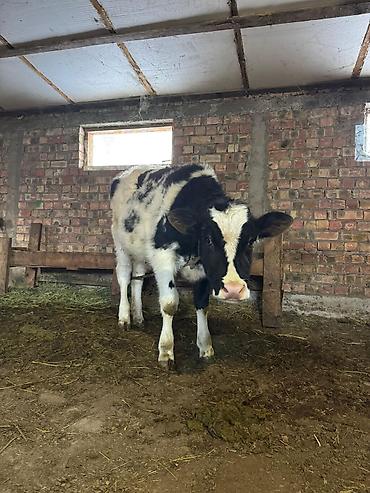 Телёнок чёрно-белой масти (порода типа голштин/чёрно-пёстрая). Содержится в тёплом кирпичном хлеву, на подстилке из сена. Активный, на крепких ногах, аккуратная голова, ровная спина. Уши биркованные нет — по фото видно чистую голову с широким лбом. Удобно подходит к кормушке, привык к привязному содержанию.