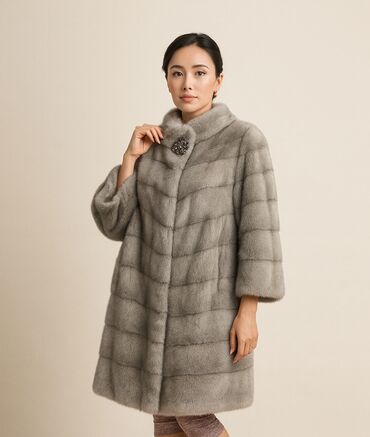 Женская шуба из норки, классического прямого кроя. Цвет — нежный серо-дымчатый. Горизонтальная раскладка шкурок создаёт аккуратные поперечные полосы и визуально выравнивает силуэт.