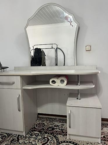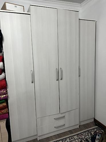 Предлагается комплект мебели для спальни, включающий шкаф, комод с зеркалом и каркас кровати. Шкаф имеет двухстворчатую конструкцию с одной секцией для вешалок и выдвижными ящиками внизу, а также в...