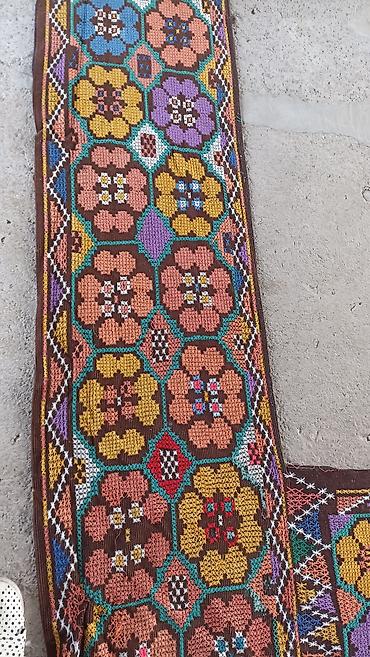 - Техника: плотное ткачество/вышивка с фактурным рисунком; по краям — декоративные каймы с ромбами и крестиками