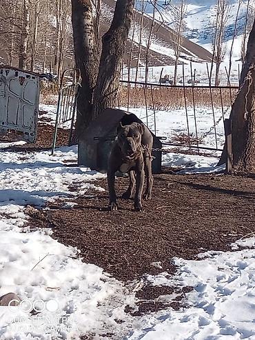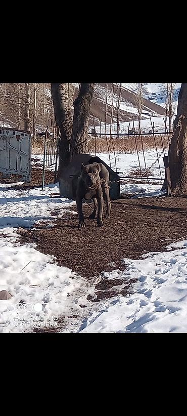 Собака крупного типа, мощного телосложения, короткошёрстная, окраса серый (блю). Уши купированные. Широкая грудь, развитая мускулатура, крепкие лапы, уверенная стойка. На фото — на привязи у будки на улице.
