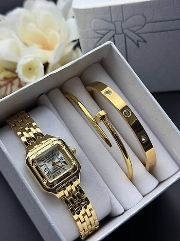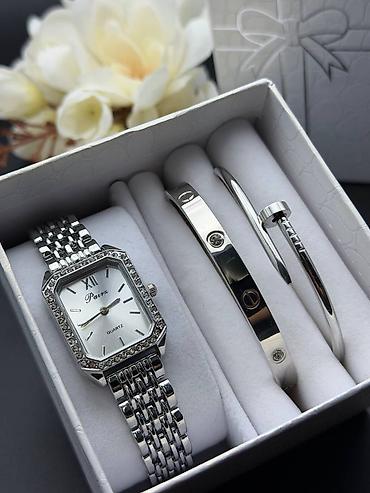 - Серебро: часы с белым циферблатом и контуром, украшенным прозрачными камнями; браслеты в том же оттенке.