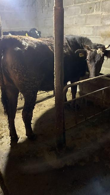 Бычок молодого возраста. Описание: - Окрас: темно-коричневый/черный. - Уши с бирками для идентификации. - На фото — крепкое телосложение, ровная спина, развитые конечности. - Содержится на подворь...