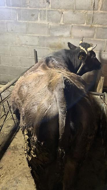 Бык мясного направления. - Окрас: черный с рыжеватыми подпалинами. - Возраст: молодой бычок (по фото — рогатый, с бирками в ушах). - Содержание: стойловое, на привязи. - Кормление: сено/сенаж, вид...